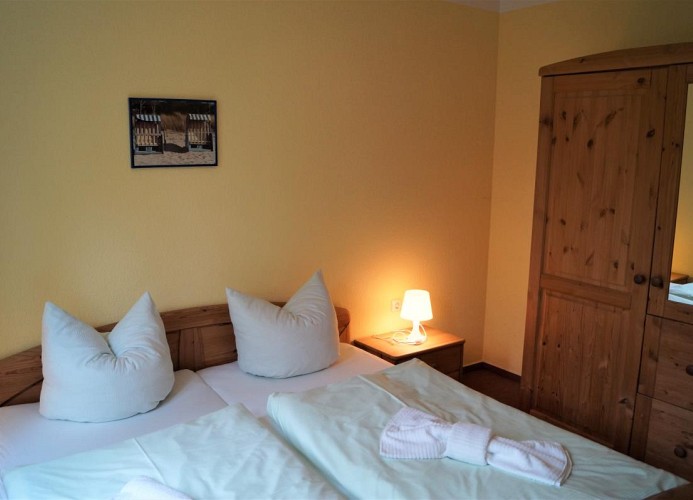 In dem separaten Schlafzimmer stehen ein Doppelbett sowie ein geräumiger Kleiderschrank. Weitere Schlafmöglichkeiten bietet die Ausziehcouch im Wohnzimmer.