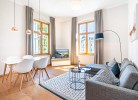 Auch auf dieser Etage sorgen die hohen, lichtdurchfluteten Räume für eine Wohnatmosphäre der ganz besonderen Art. In der Villa Marie wurde der Charakter des alten Hauses geschmackvoll kombiniert mit den modernen Ansprüchen von heute. Im großzügigen Wohnzimmer gibt es neben einer gemütlichen Sitzecke einen modernen Smart-TV, der ein vielfältiges Unterhaltungsprogramm garantiert. Eine Schlafcouch bietet Platz für einen dritten Übernachtungsgast. Die moderne Einbauküche ist mit hochwertigen Markengeräten ausgestattet und lässt kaum einen Wunsch offen. Ein schöner Essplatz befindet sich in unmittelbarer Reichweite.