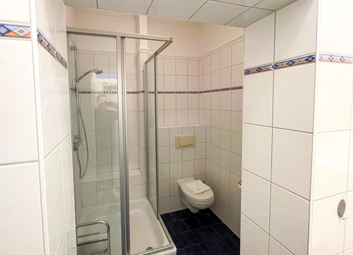 Das Badezimmer ist mit Dusche, Waschbecken und WC ausgestattet. Ein Fön ist vorhanden.